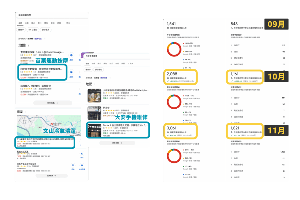 - 成效:這是你的數據儀表板。後台可以清楚看到使用者如何找到你、有多少人看過你的商家檔案、大家都是搜尋哪些「關鍵字」找到你。